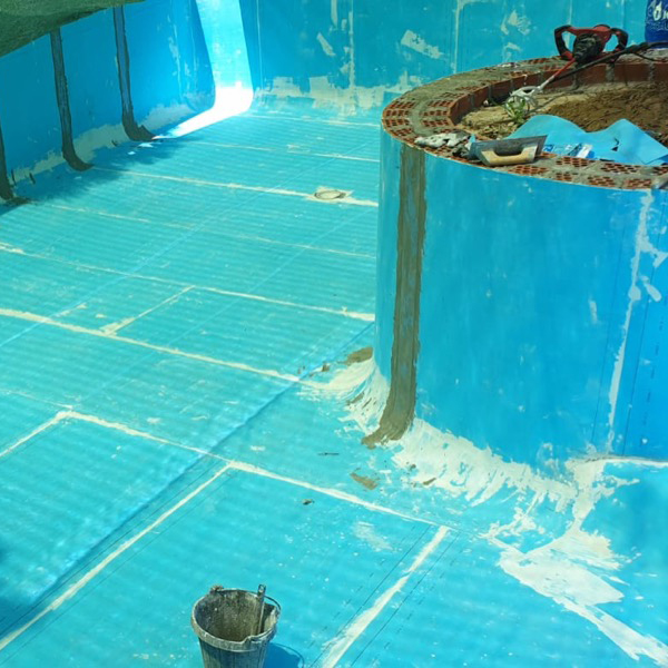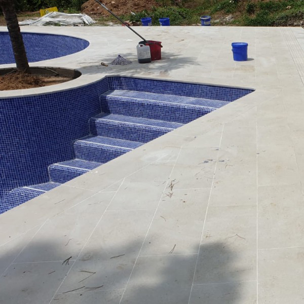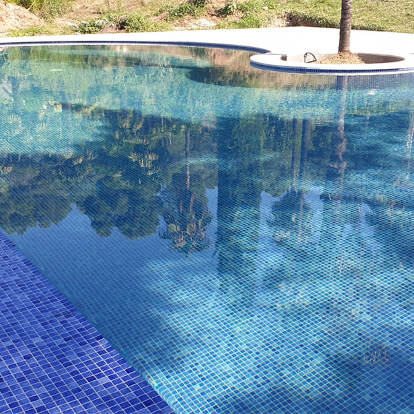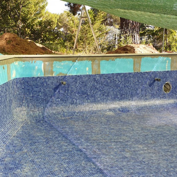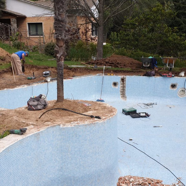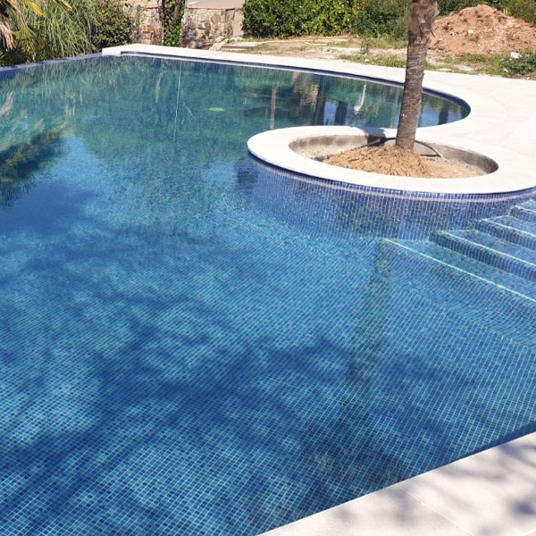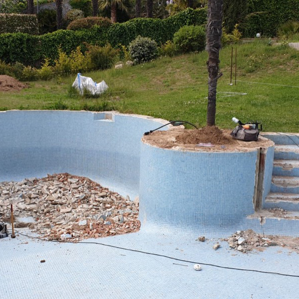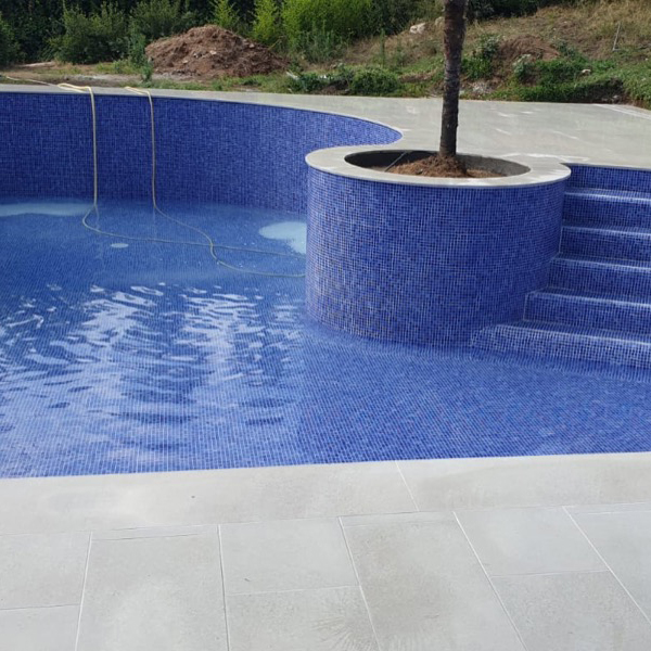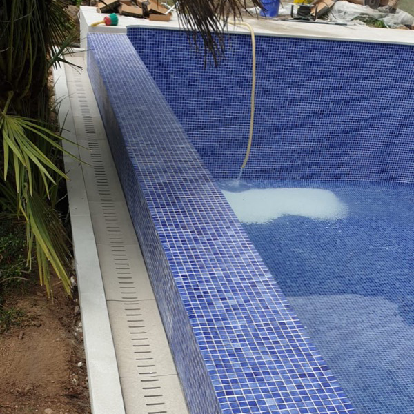 Rehabilitación y reforma de piscina, con construcción de cascada rebosante y terrazas. Lamina de impermeabilización Signapool y gresite Hisbalit modelo Jónico. Coronación, terrazas y canales de porcelanico marca Ceramicas Mayor modelo Stromboli light